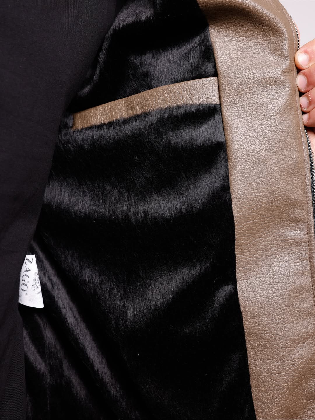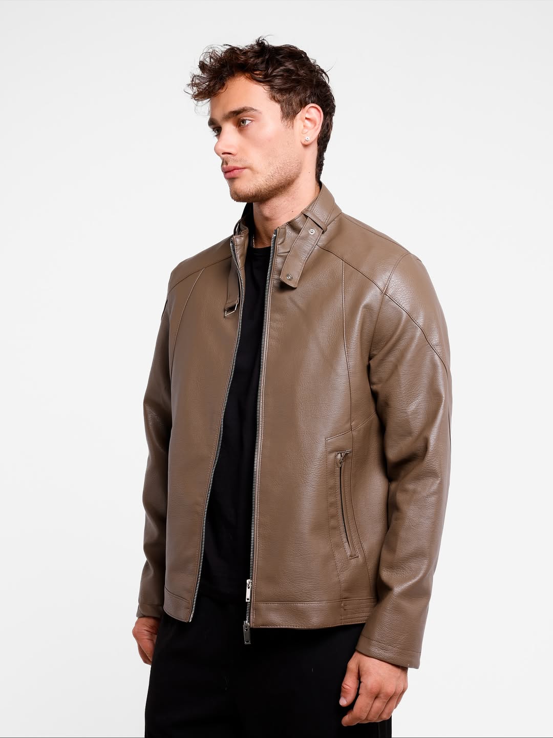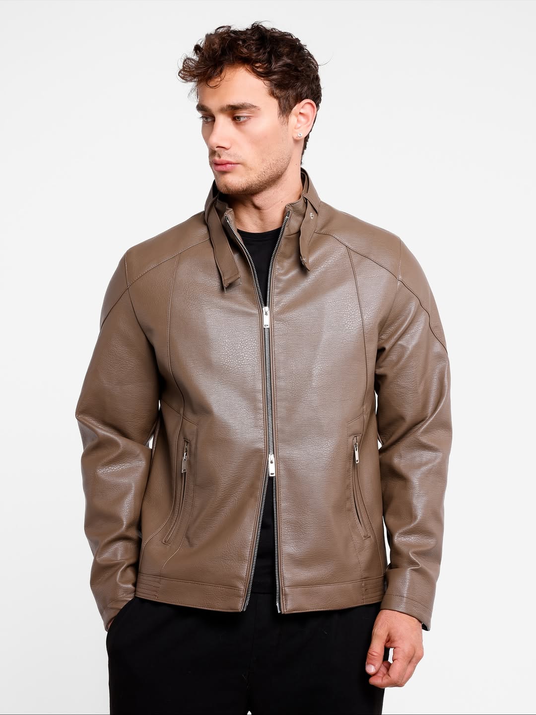 MAGICALFASHION Hakim Yaka Düz Fermuarlı Camel (Vizon) Erkek Suni Deri Ceket - Erkek Giyim