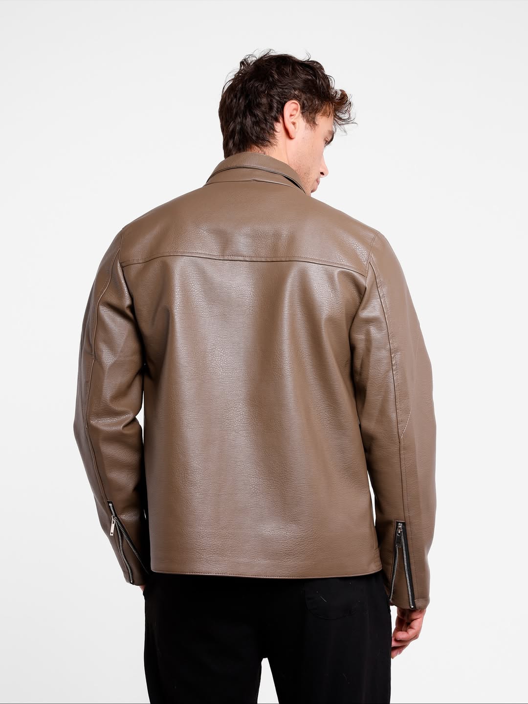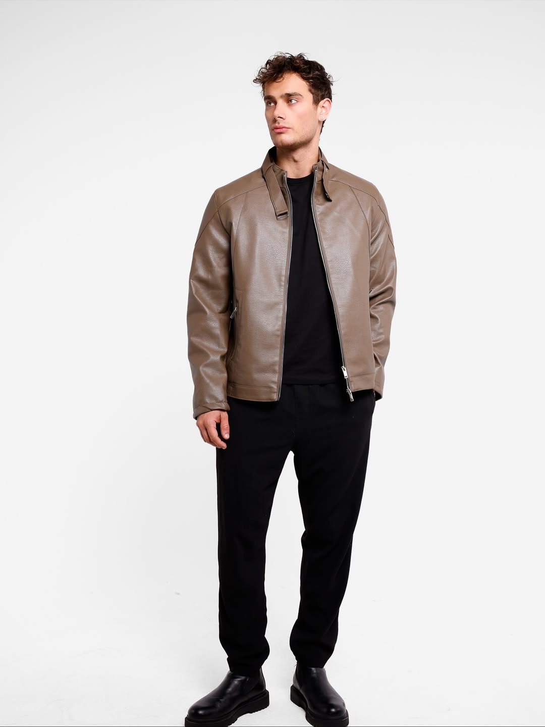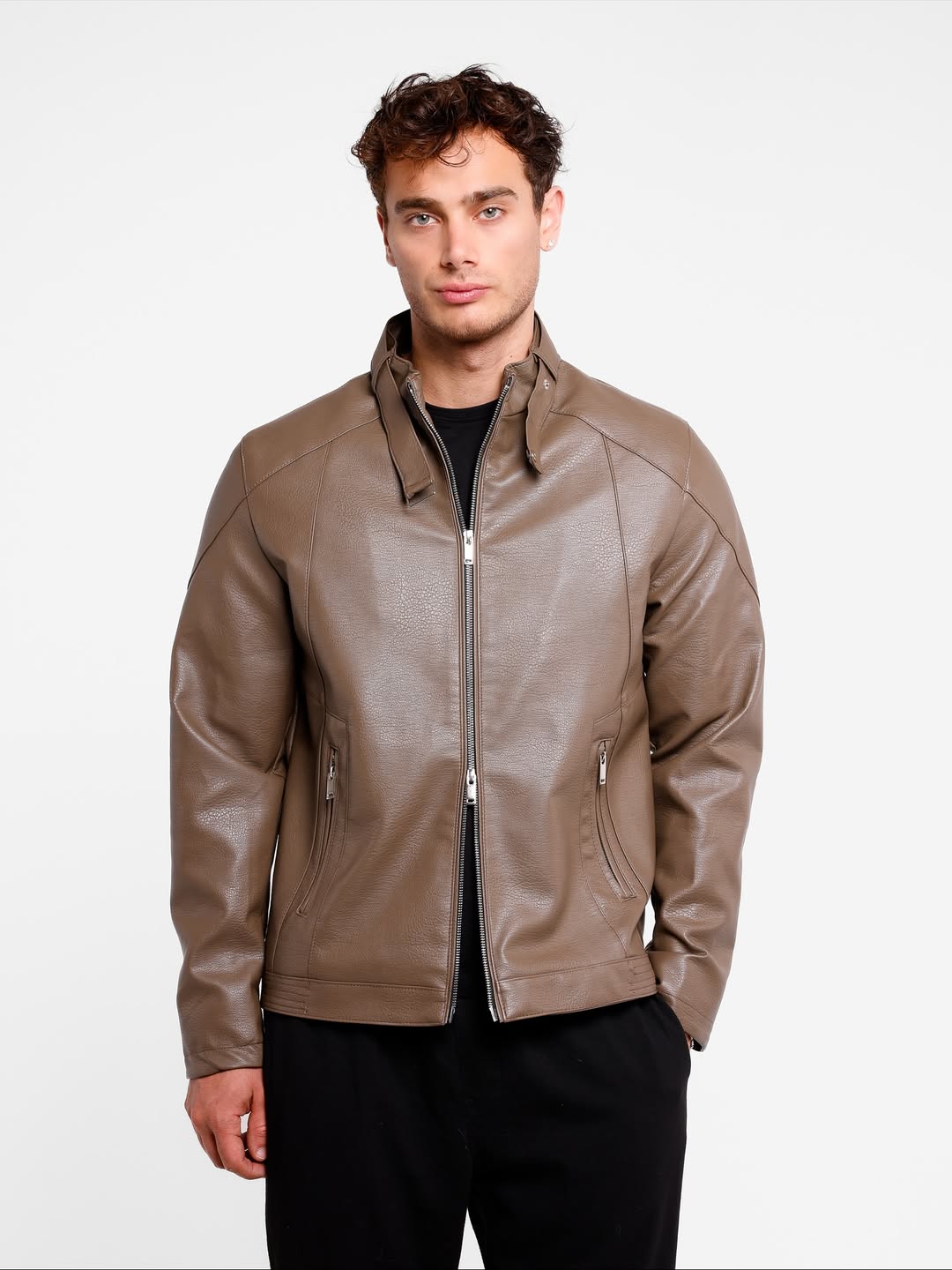MAGICALFASHION Hakim Yaka Düz Fermuarlı Camel (Vizon) Erkek Suni Deri Ceket - Erkek Giyim
